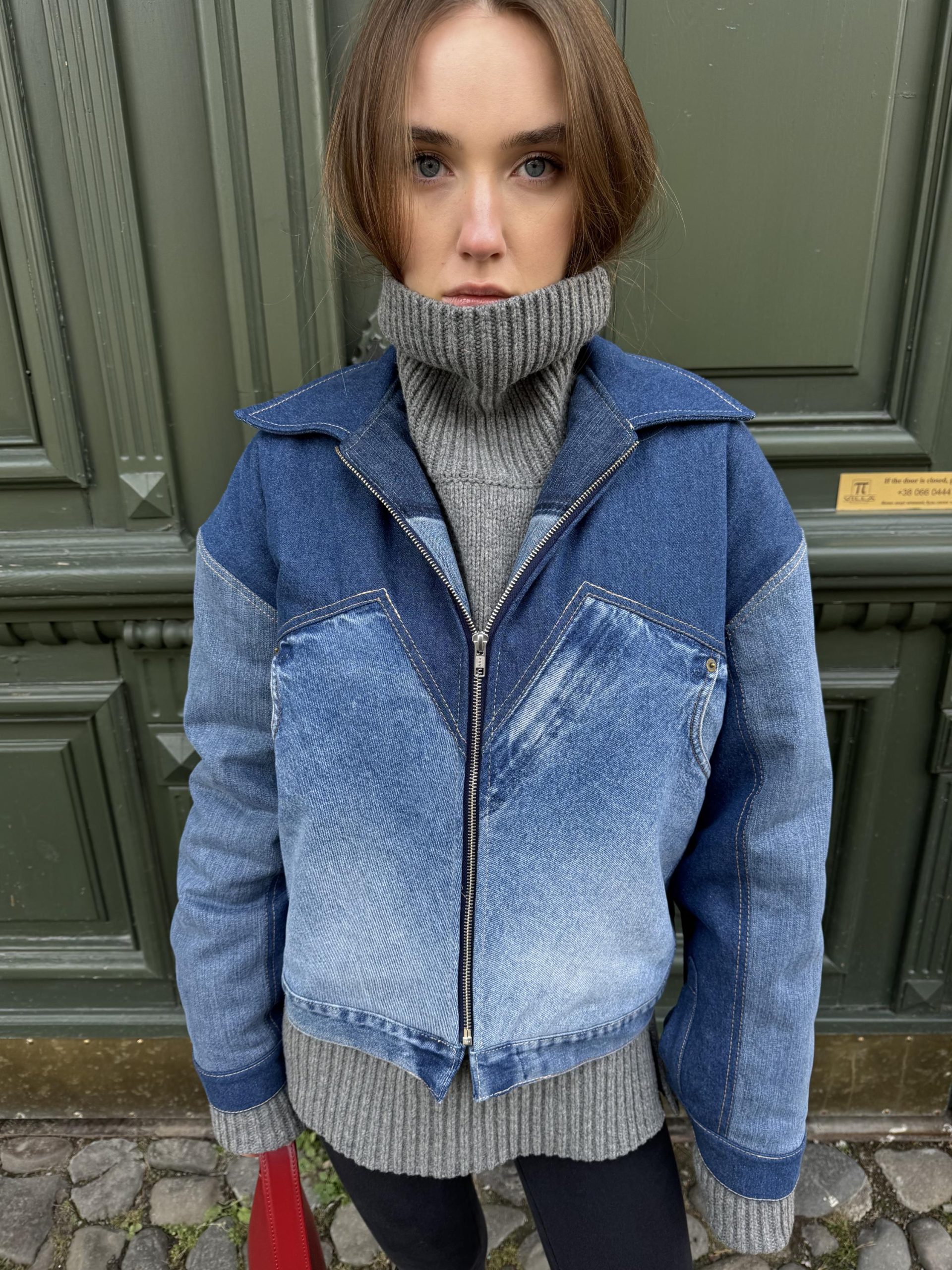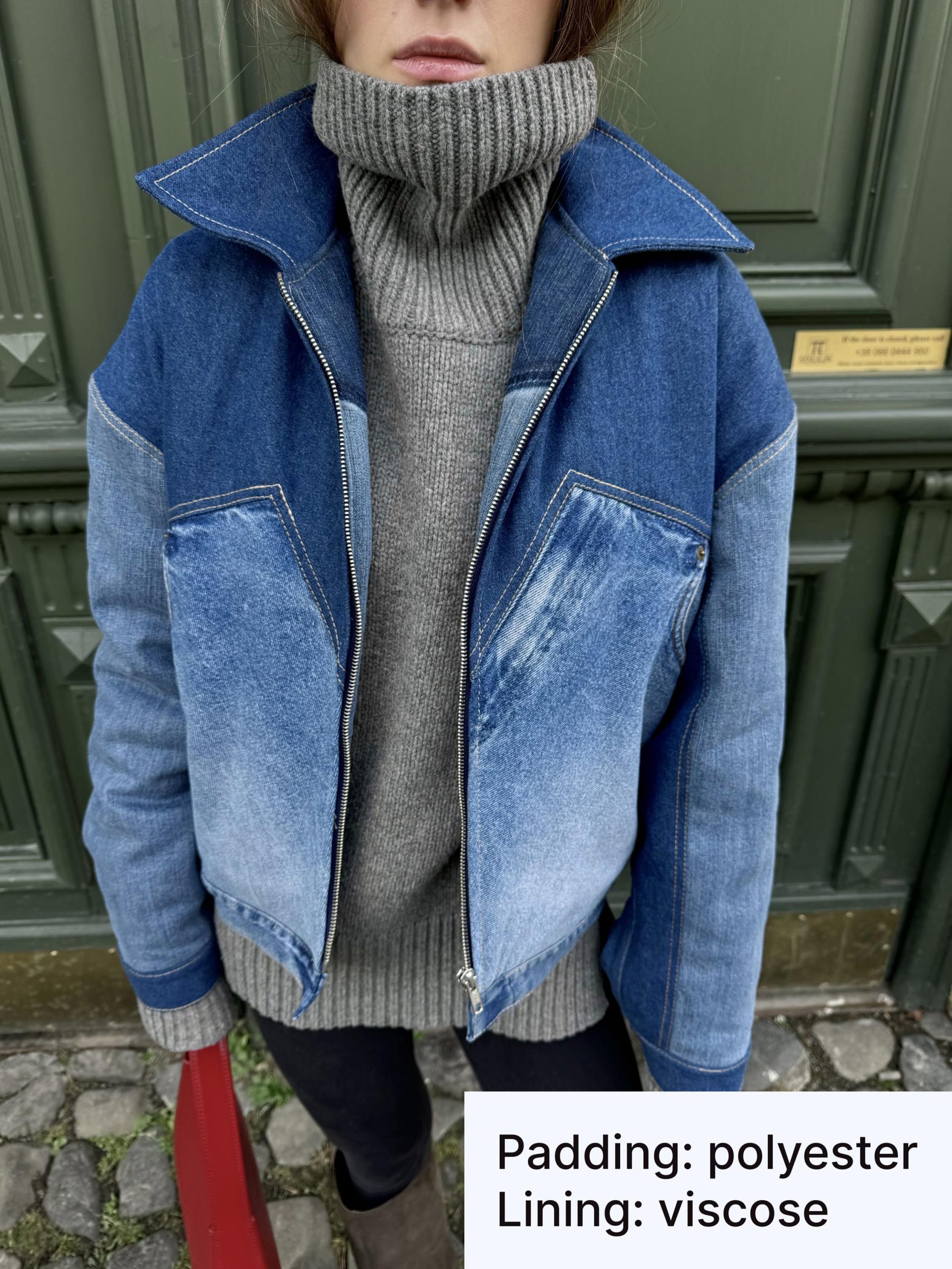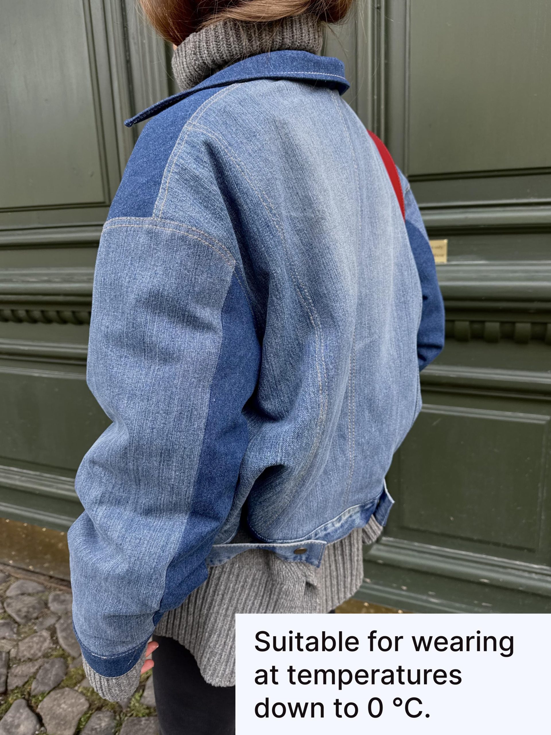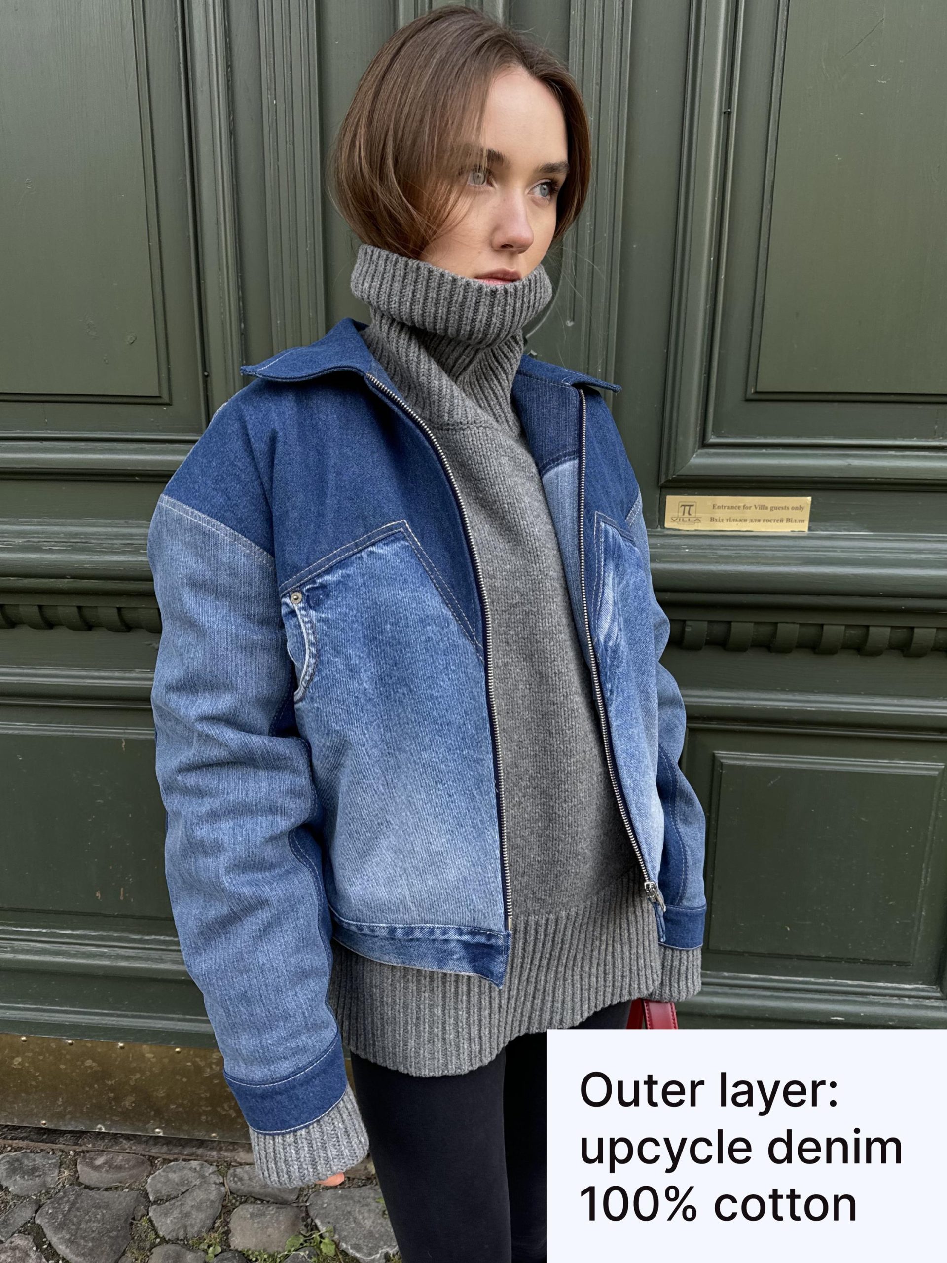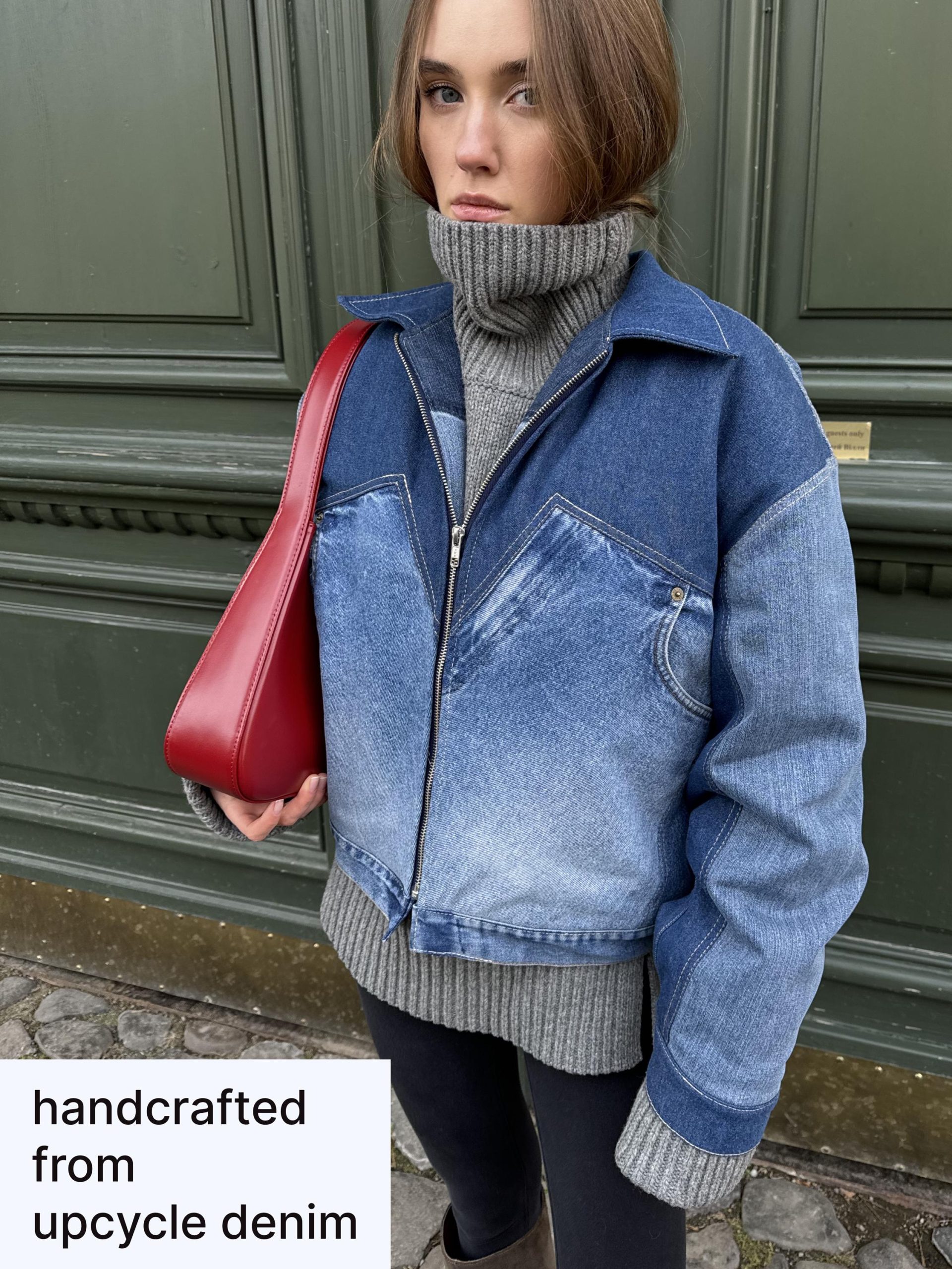 Patchwork jacket. crafted from upcycled denim. Padded for warmth. comfortable to wear down to 0 °C. Designed with an oversized bomber fit. full front zipper. side pockets. and a structured collar.
