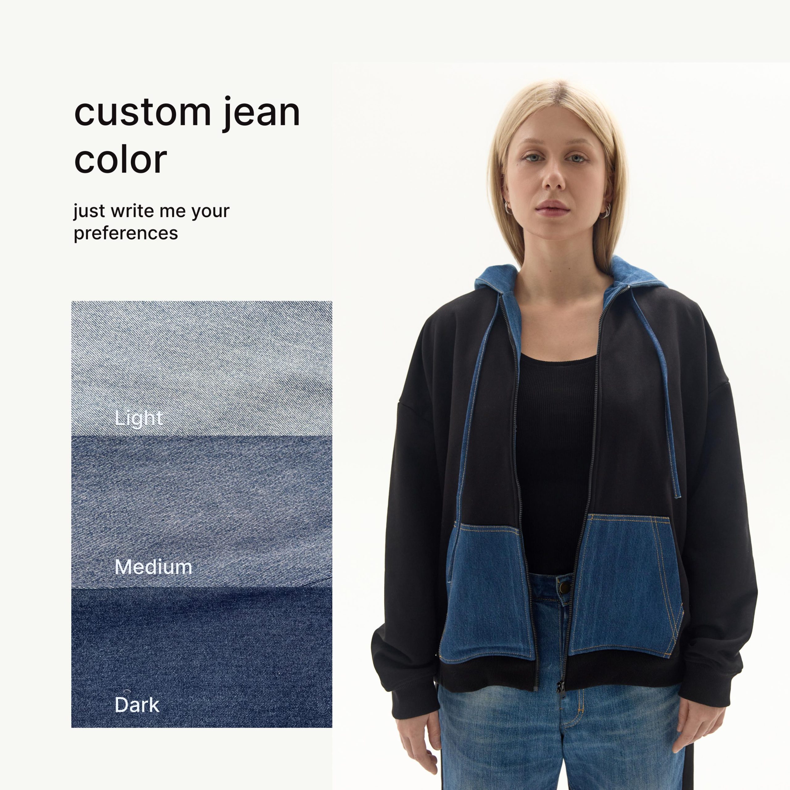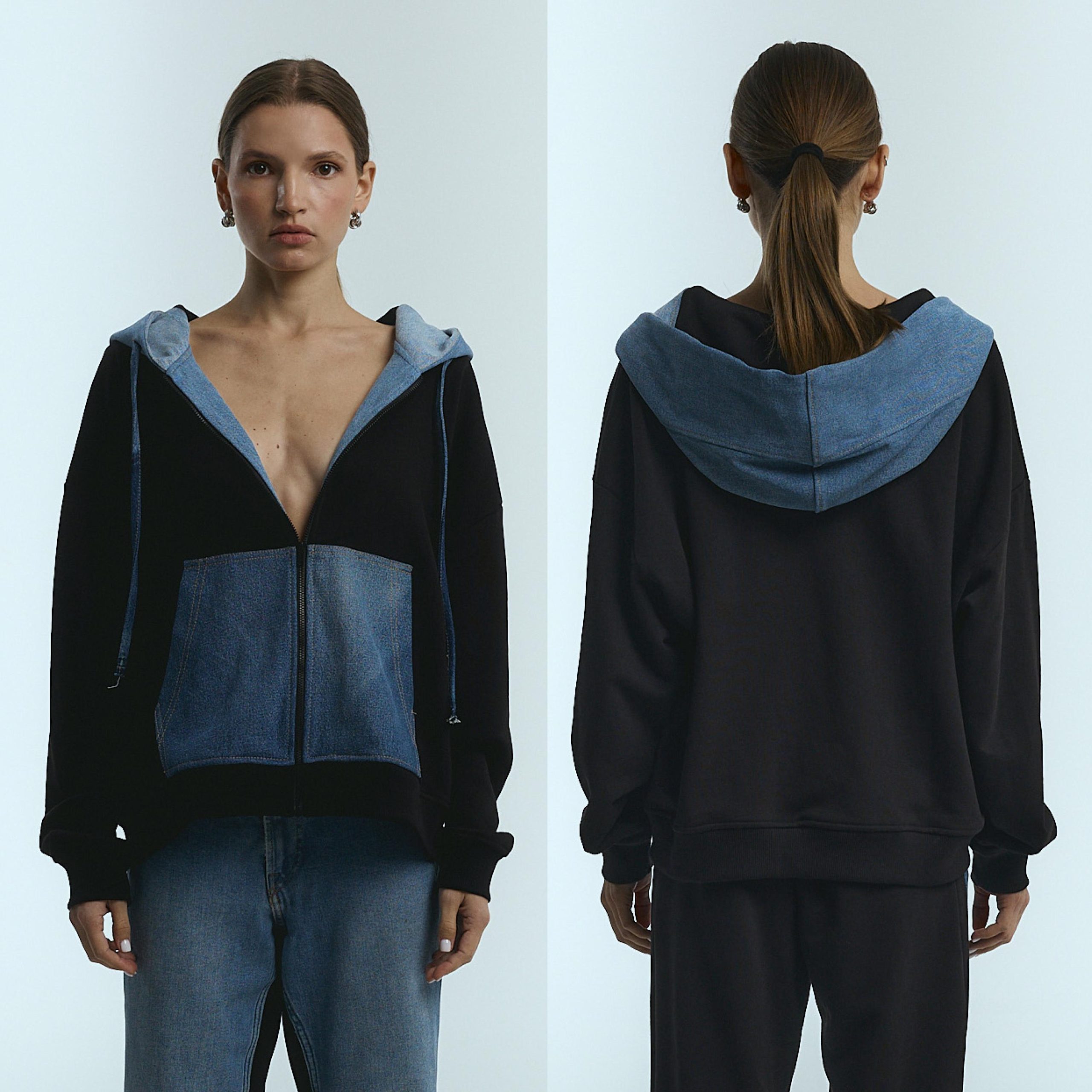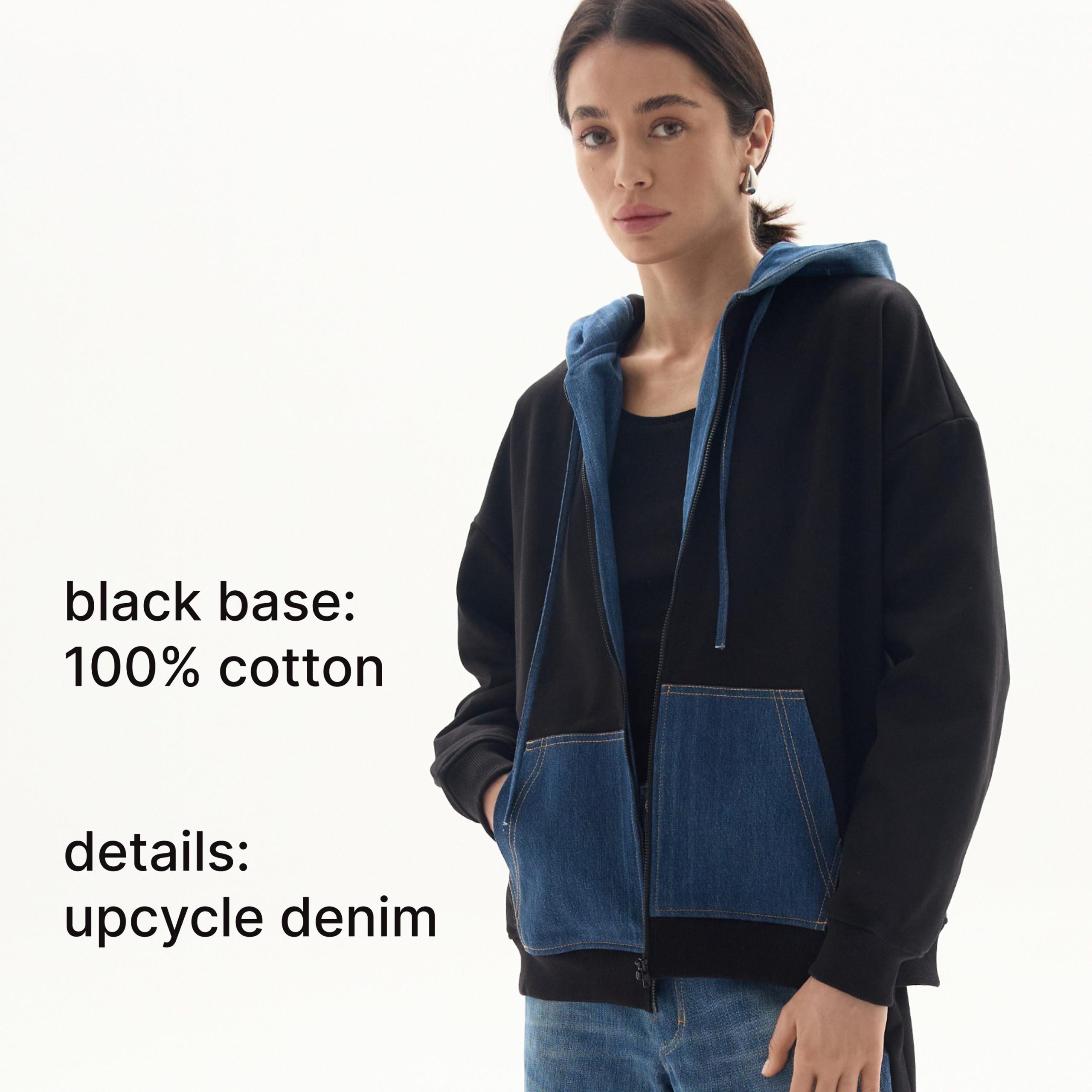 Drawstring denim hood. zip down the front. diagonal welt side pockets. and wide ribbing at the cuffs and hem. The hood and large kangaroo pockets are crafted from blue upcycle denim.