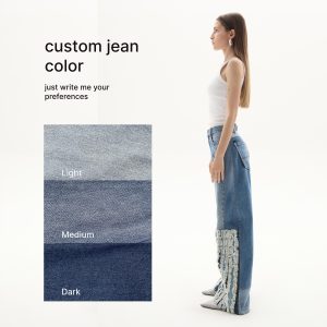 The uniqueness of jeans lies in the texture. The fabric features multiple layers of frayed and raw-edged denim strips sewn vertically.