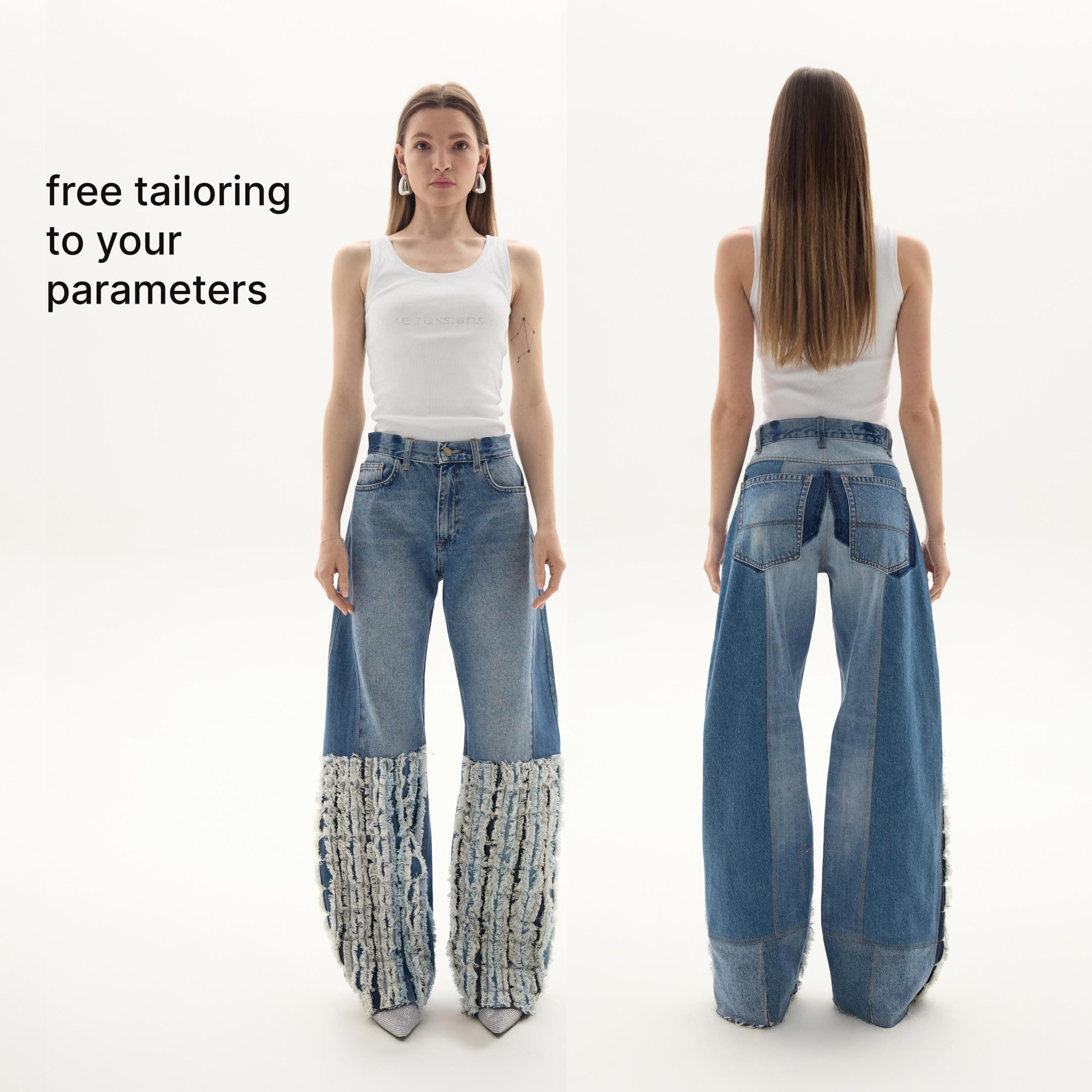 Upcycled patchwork jeans handcrafted from different shades of blue denim. Baggy. mid-rise. wide leg. Custom jeans.
